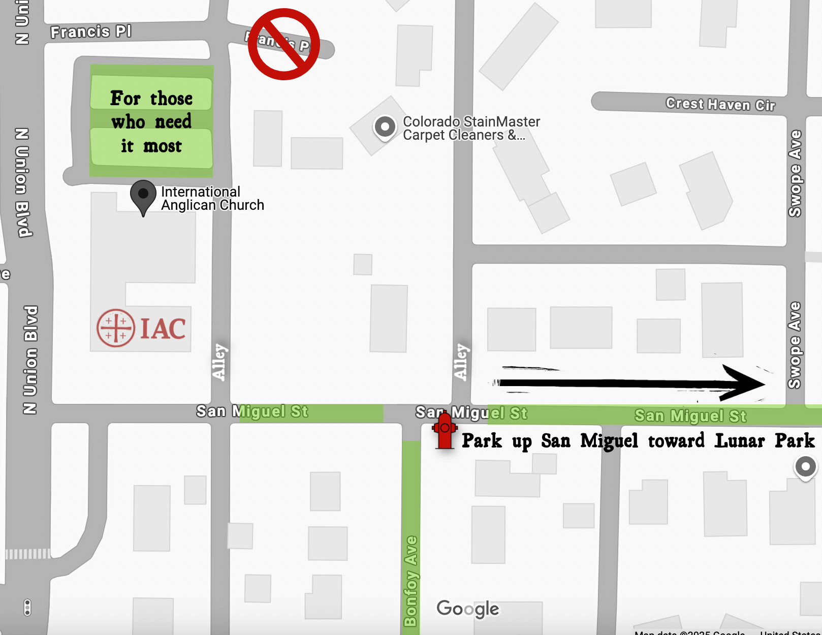 As you are able, please help us create space in the parking lot by parking on San Miguel and other side streets such as Bonfoy Ave (highlighted on the map below.) Please avoid blocking alleys, driveways, or fire hydrants. There is also no longer parking available in the cul-de-sac on Francis Pl.